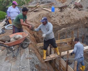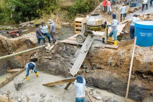 Con el apoyo activo de la comunidad de San Francisco del Mache, la Prefectura construye un muro de hormigón para la instalación del puente de estructura metálica de 10 metros de longitud, sobre el río Machecito, en la parroquia Plan Piloto.